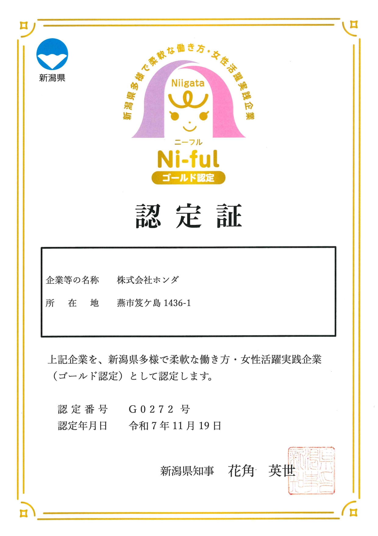 この度、当社は、新潟県多様で柔軟な働き方・女性活躍実践企業認定制度(Ni-ful:ニーフル)において「Ni-fulゴールド認定企業」として認定を取得いたしました。(取得日:2025年11月19日)